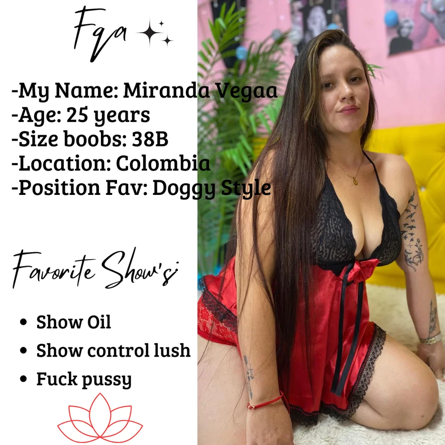 🍒My name is Miranda Vegaa, you can also call me Sweet. Basically I like making erotic teasing shows, but sometimes I'm open to something a little more naughty. I don't know what you would like to know about me - but I am ready to answer any of your questions in the chat.🍒 To be honest, I adore streaming here. Wonderful followers, tons of compliments, warm atmosphere and fun - all this makes me so happy that I just can't stop smiling during the broadcast. Guys you are amazing! Thank u for every compliment, token and just moment with you. I love u soooo much!🍒